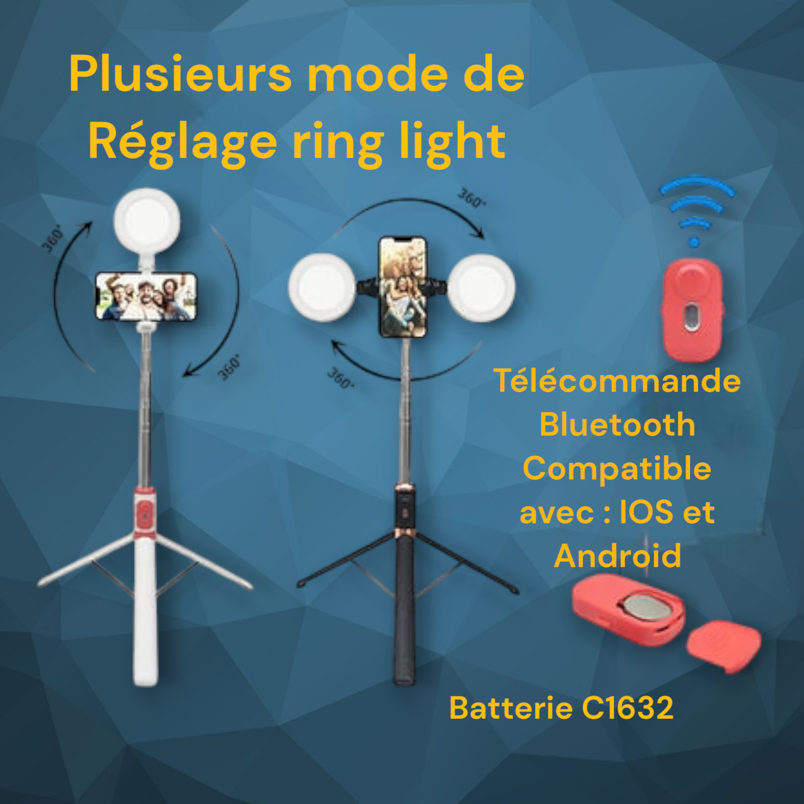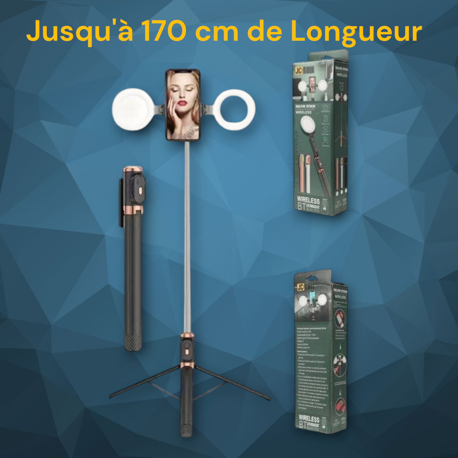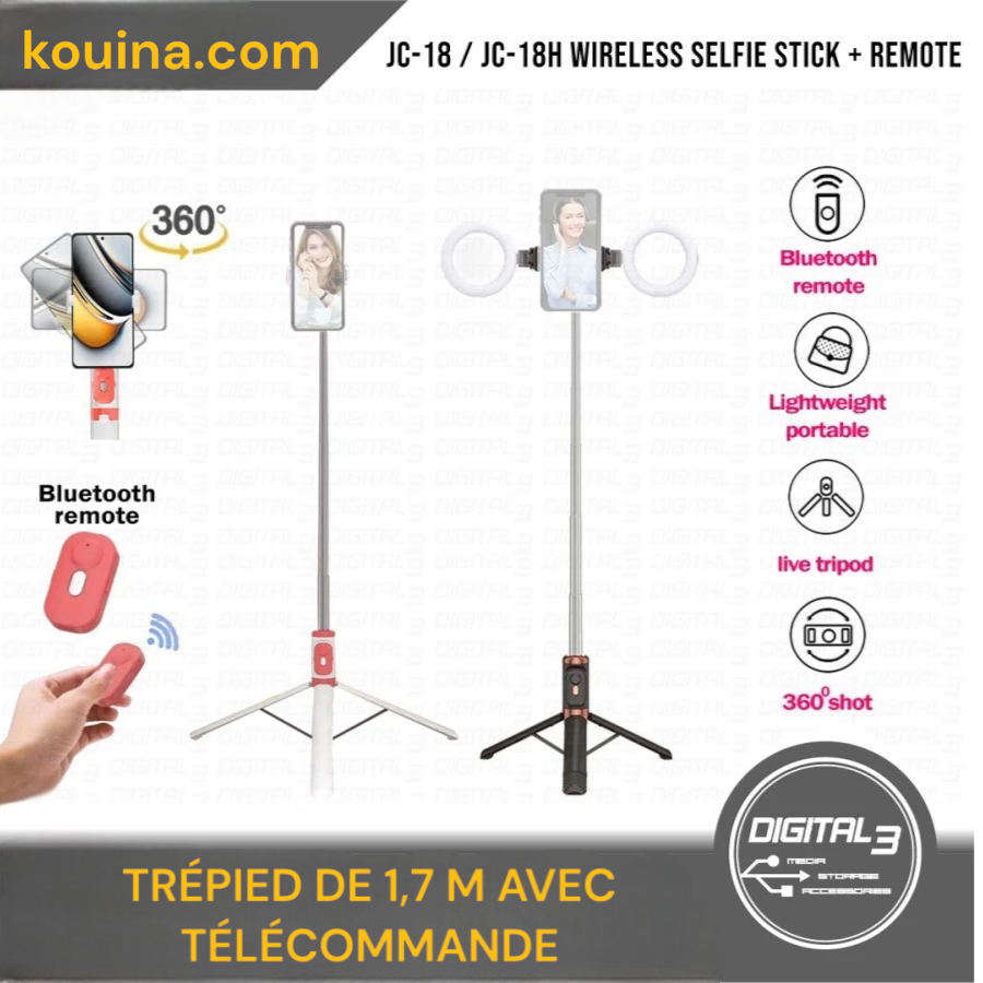 trépied JC-18H avec lumière LED, télécommande Bluetooth, longueur maximale 1,7 m.